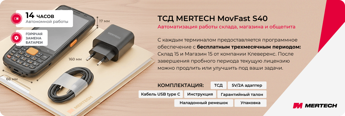 На каждый MERTECH MovFast S40 предустановлено программное обеспечение с бесплатным трехмесячным периодом: Склад 15 и Магазин 15 от компании Клеверенс. После завершения пробного периода текущую лицензию можно продлить или улучшить.